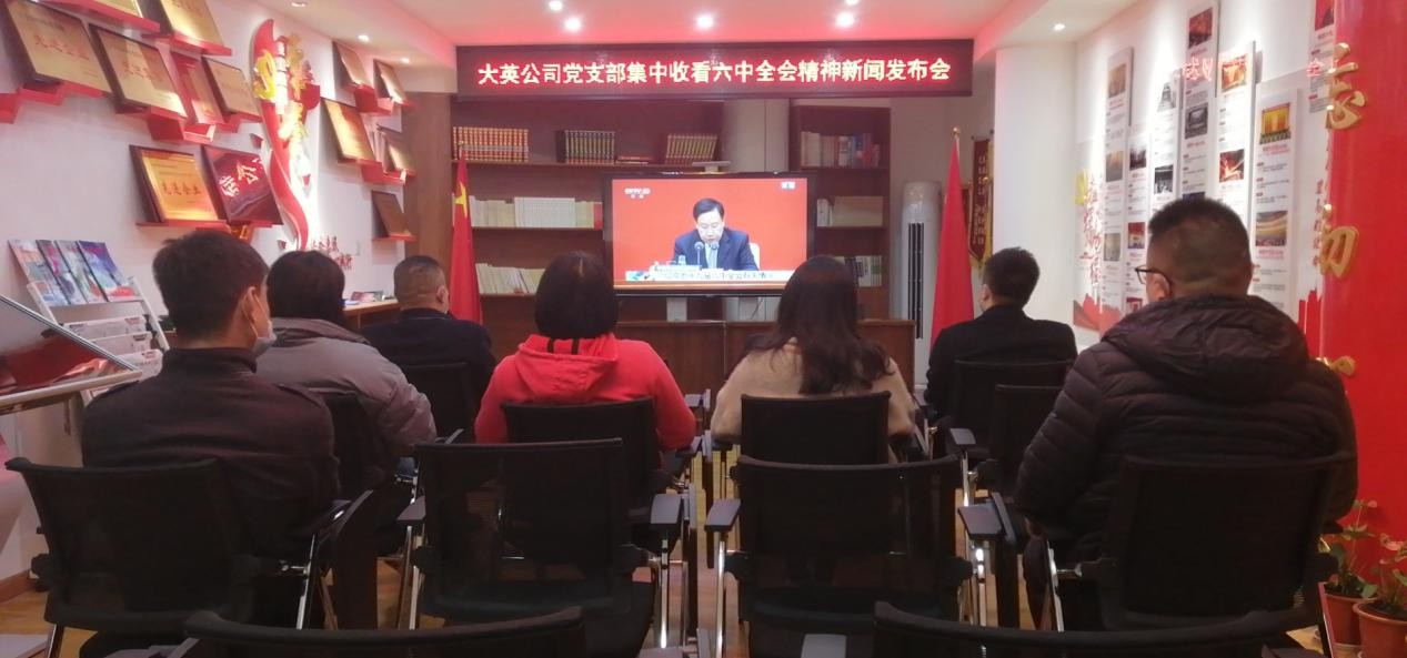 11月12日上午10時,中共中央在北京舉行新聞發(fā)布會,介紹黨的十九屆六中全會精神,并答記者問。川投水務(wù)大英公司黨支部積極組織廣大黨員干部,在五樓黨員活動室,集中收看新聞發(fā)布會現(xiàn)場直播,工作一線、外勤黨員,通過手機、電腦等多種形式,學習全會公報內(nèi)容,認真領(lǐng)會本次全會精神。